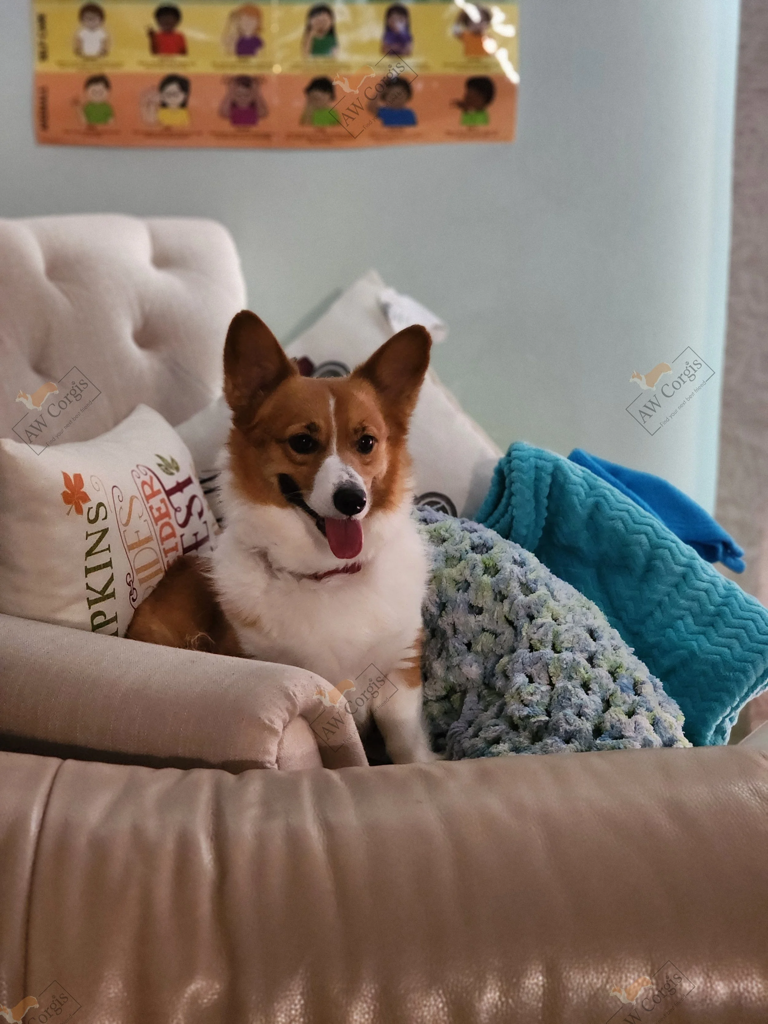 Ginger just had a beautiful litter of 2 boys but unfortunately she had to have another C-Section and so we made the choice to spay and retire her from our breeding program. Ginger will be living out the rest of her days here with us snuggling with her favorite person, her dad and keeping all the other corgi’s in line.